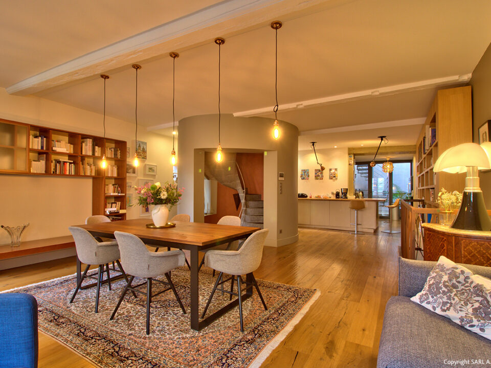 Enfin au deuxième et dernier étage, par un escalier dédié, découvrez un charmant duplex d’environ 90m². Lui aussi offre un bel espace d’entrée avec rangement, distribuant un superbe séjour avec de hauts plafonds mansardés et surplombé d’une mezzanine. La vue à ce niveau est encore plus agréable. Deux grandes chambres, elles aussi au calme, ainsi qu’une salle de bains et un cabinet de toilette complètent ce dernier niveau.