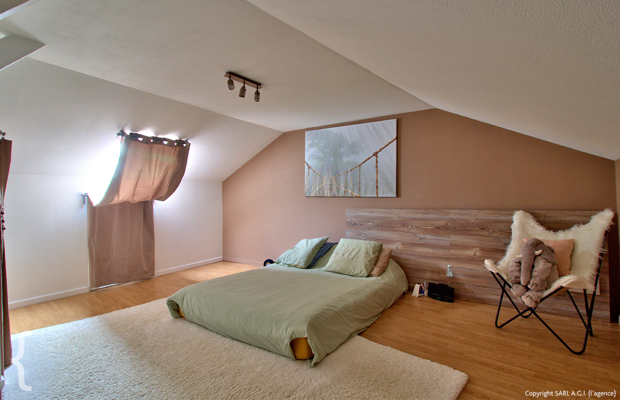 Un escalier en bois harmonieusement intégré au séjour mène à l’étage. Vous y découvrirez un espace cosy entièrement mansardé avec poutres apparentes et lumière naturelle généreuse grâce aux vélux. Cet étage propose une première partie pouvant faire office de salon intime ou de dressing, dans la continuité d’une chambre pleine de charme. Les parties basses en fond de mansarde sont aménagées en espaces de grenier, idéales pour du stockage supplémentaire.