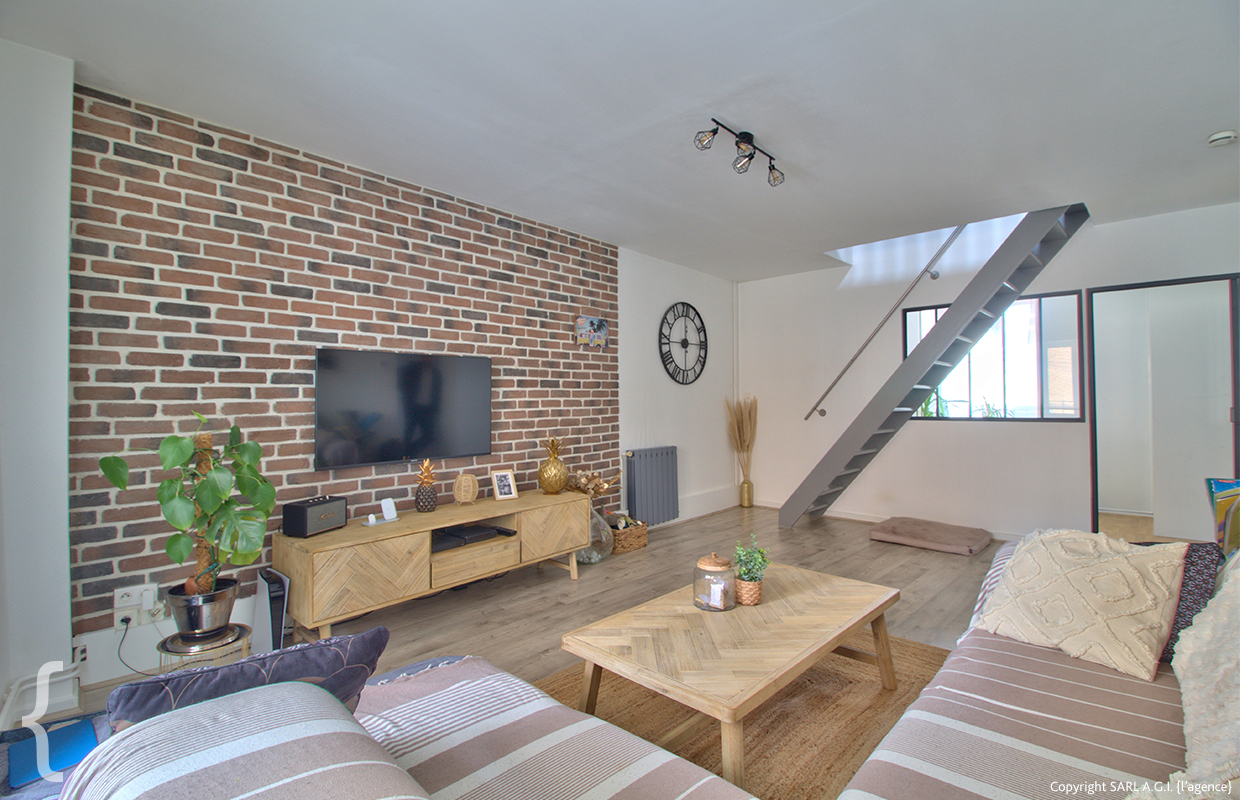 Situé au premier étage, l’appartement bénéficie d’un accès totalement indépendant grâce à un hall d’entrée privatif avec rangement au rez-de-chaussée. Un escalier privé vous conduit vers un dégagement desservant une agréable pièce de vie chaleureuse. Parquet, briques de parement et verrière esprit atelier confèrent à l’ensemble un caractère authentique et une touche industrielle élégante, tout en permettant de créer un espace bureau distinct et lumineux.